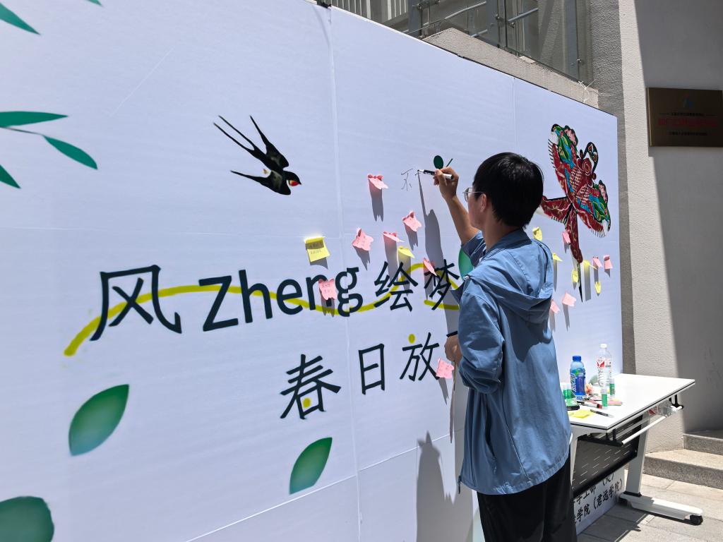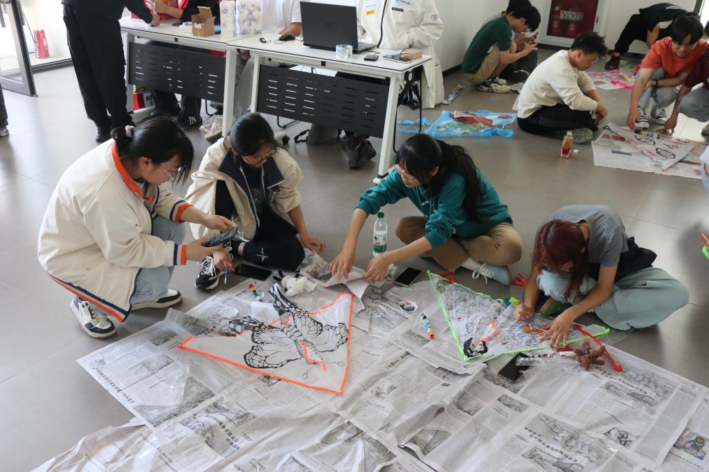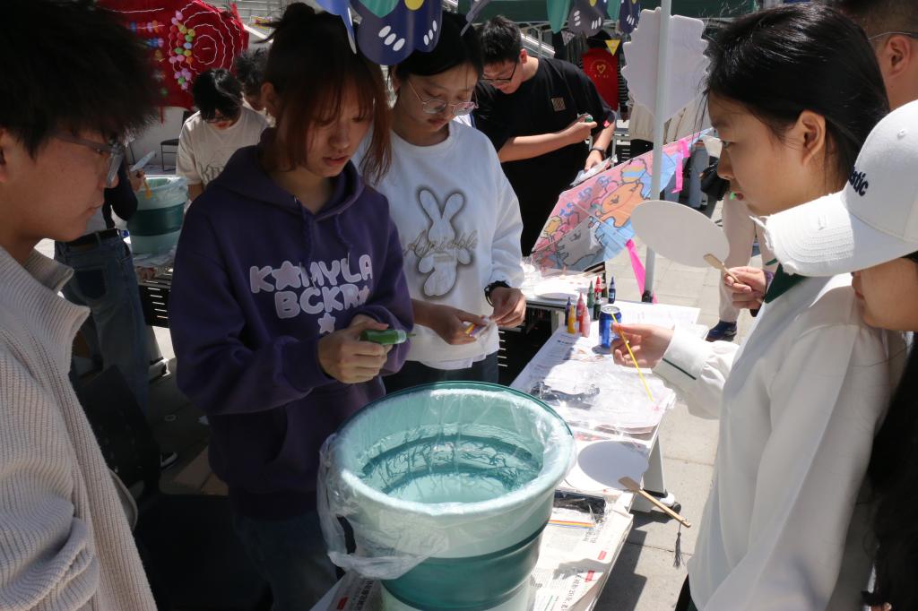随后,“多巴胺工坊”成为创意主战场,同学们用参与游戏赢得的颜料在风筝上创作,释放天马行空的想象力。现场同步开展的漆扇制作体验活动,更以传统工艺之美为创意表达锦上添花。最燃的“压力动能转化场”环节,各团队奔跑着放飞风筝,五彩斑斓的“希望之翼”翱翔天际,在色彩碰撞与自然灵感中完成心灵的疗愈。活动最后,同学们一起清理场地,守护春日美好,并与自己亲手制作的风筝合影,留下美好纪念时刻。