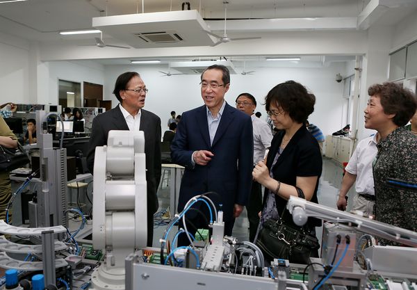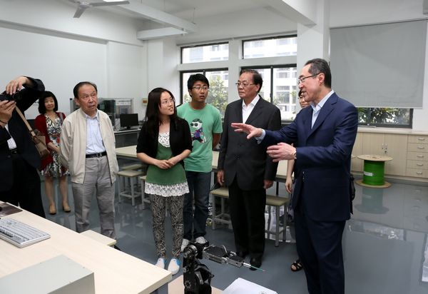 君远书院成立典礼结束后,唐英年先生及夫人、华博雅副市长等与君远学子合影留念。随后各位嘉宾顶风冒雨,前往PlayAce游戏平台的“君远工程中心”参观考察,在张秋菊经理的引领下,唐英年先生饶有兴趣地视察了PLC、数控、印刷电路、机电一体化创新实验室等,观看学子们如何设计程序、操纵设备,他非常专注地与师生讨论专业问题,对君远工程中心的建设与使用表示满意。接着各位嘉宾参观了纺服公司的汉民间服饰传习馆和教育部经编工程中心,唐先生向在场的教授询问了纬编设备的品牌与型号,对智能化无缝内衣的经编新技术研发表示赞赏。