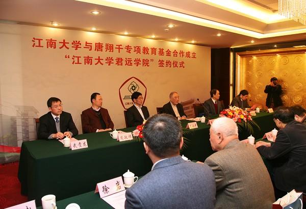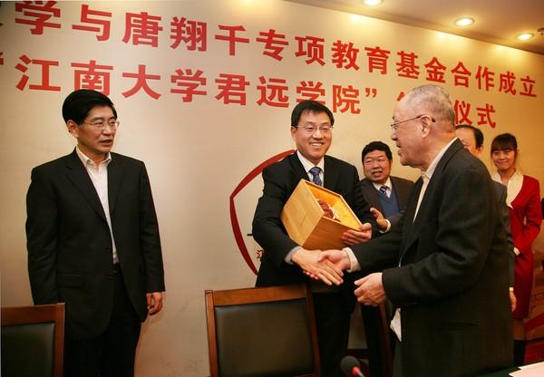 董事长陈坚在签约仪式上致辞。他说,上海唐君远教育基金会以“爱国重教,培育英才”为宗旨,本着教育为立国之本,人才为建设之基的精神,大力支持教育事业,促进社会和谐发展。几十年来,君远教育基金会资助了数以千计的员工和近百所中小学和职业院校。今天,唐君远教育基金会选择与PlayAce官方网站合作举办PlayAce游戏平台,是对公司办学征程的高度肯定和莫大鼓励。他代表公司对唐君远教育基金会爱国重教的义举表示由衷的敬意和诚挚的感谢。公司党委书武贵龙向唐翔千先生赠送了由江苏省工艺美术大师李荣仁先生创作的手捏紫砂雕塑纪念品。
