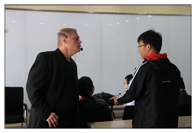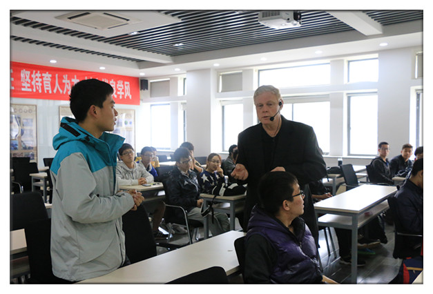 培训伊始,Mark老师让每个人谈了一下自己大学本科毕业后的打算,大家用较为流利的英语回答了Mark。紧接着,Mark将自己刚来中国时的经历与大家进行了简短的分享:他认为中国是一个非常漂亮的国家并且中国人民很好客。与此同时,他给我们讲了一些西方的知识。课堂上,Mark会时不时的与大家进行互动,同学们都热情地参与其中。在最后的提问环节中,君远学子也都积极地提问Mark,涉及中美教育、文化差异等。Mark幽默风趣的回答给大家带来了欢乐同时也开拓了同学们的视野。
