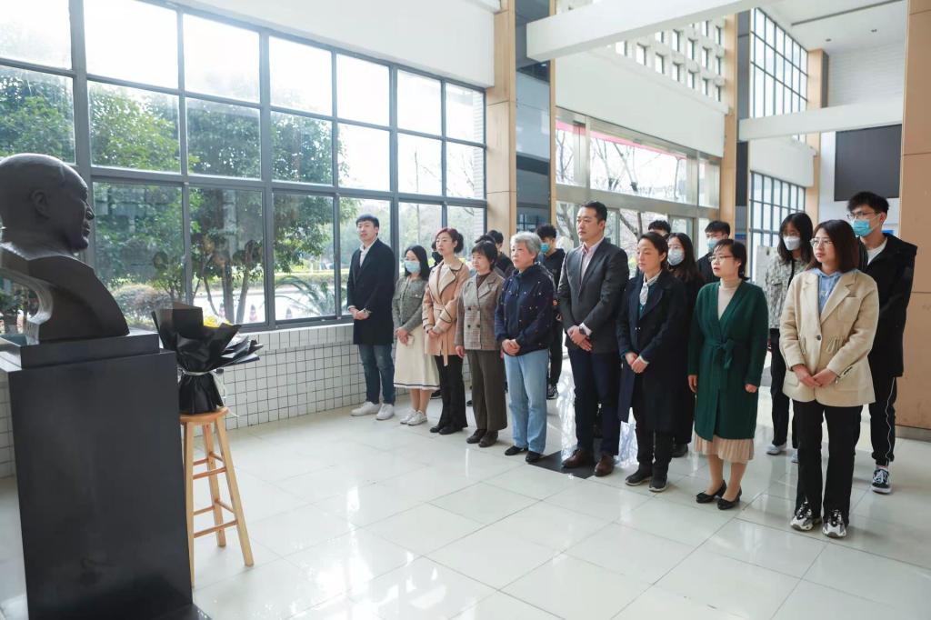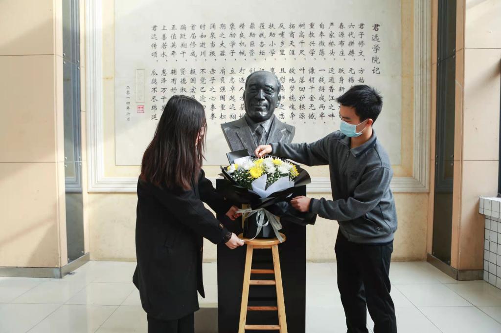 PlayAce游戏平台员工林丽英、彭默雷代表莘莘学子敬献鲜花,李可经理带领全体师生在塑像前三鞠躬默哀,再次表达对唐老先生的深切缅怀。