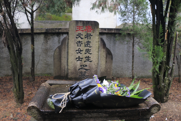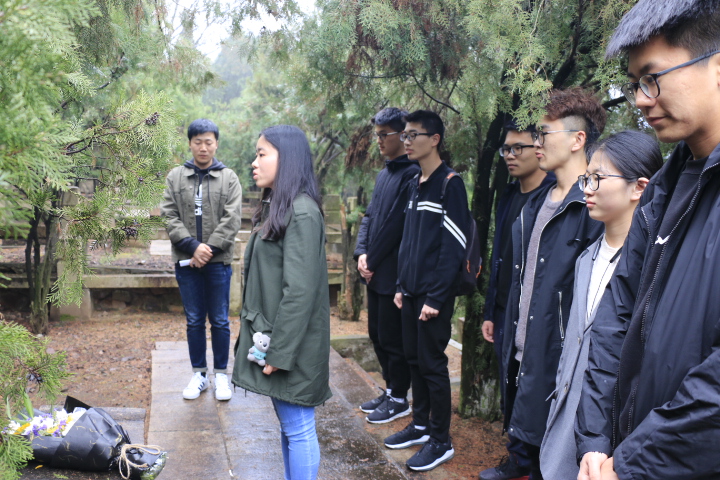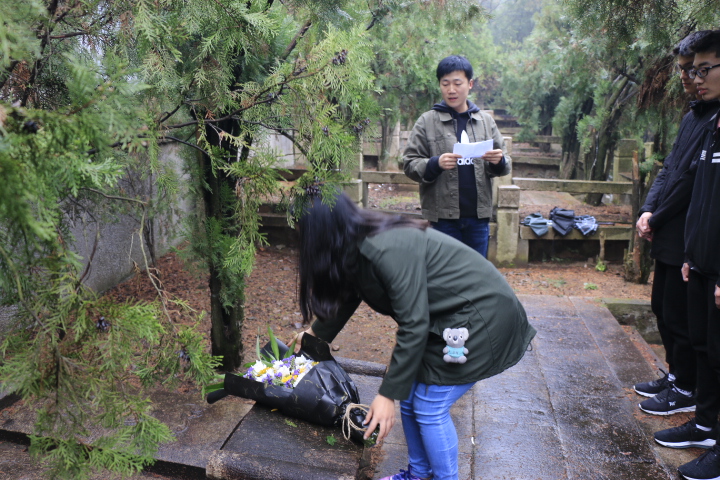 坐上驶往公墓的车,阴雨连绵的天压抑着同学们的心,更引发了对唐君远老先生的感激与怀念之情。一路上,同学们哀默无言,望着窗外的细雨,轻吟绵绵思念。驶达青龙山公墓,同学们迈着沉重的脚步缓缓走近唐君远先生的墓碑。墓碑前,大家庄严而肃穆地站成一排,认真倾听孙老师讲述唐君远先生的生平。唐君远任老先生曾是上海毛纺织工业同业公会主任委员,积极参与上海工商界为恢复生产、发展经济所开展的各项爱国运动,并在抗美援朝时损献了4架飞机,其爱国重教,回馈社会的善举受到了众人的尊敬。在孙老师讲述完老先生的事迹后,同学们为老先生献上鲜花以表哀思。随后,两名员工代表向老先生表达了感激与思念,并承诺不忘老先生对君远学子的殷殷期盼,努力学习,报效祖国!最后,全体师生三次深鞠躬以示对唐君远老先生得崇高敬意。