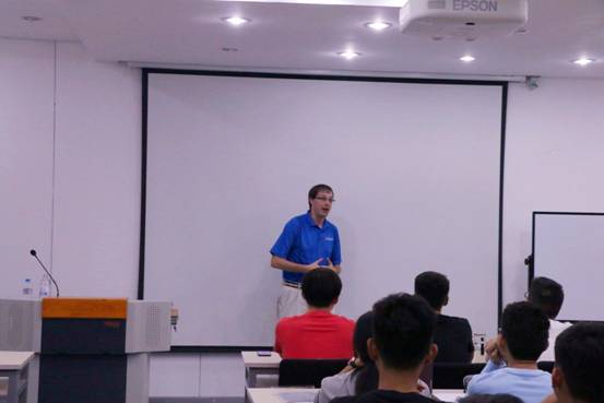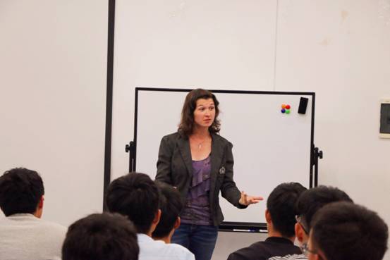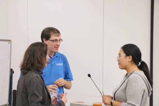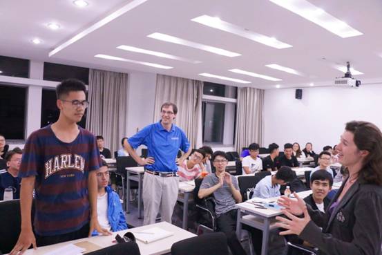 随后,两位外教对他们的教学方式进行了介绍。Jacob老师倾向于话题模块的讲课,帮助同学们了解如何去学习口语。而Erika则倾向于让同学们学习如何说出流利地道的英语。两个人互相协调配合,期望达到最好的教学效果。在课堂的最后十分钟里,Jacob和Erika邀请同学们提出自身存在的问题,同学们积极踊跃地和两位老师交流讨论,课堂气氛活泼有趣。