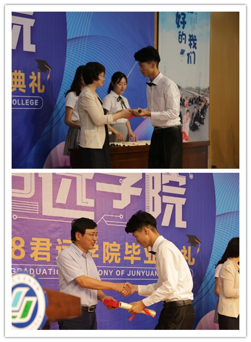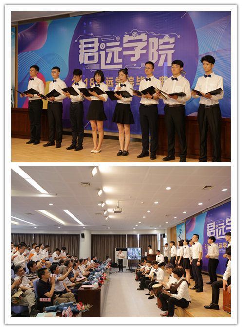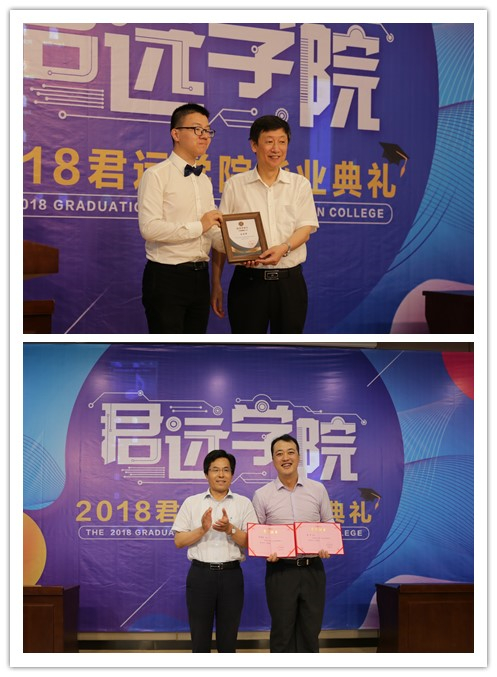 随后,由张秋菊经理主持第二篇章“筑梦.成长”。首先她向大家介绍了到场的领导和嘉宾,对所有人的莅临表示感谢,并对毕业生们致以由衷的祝贺。张经理在致辞中提到2018届毕业生毕业率95%,就业率98%,深造率39.6%,参加出国交流项目的人数占比64%,继续保持了君远学子的优秀品质与追求卓越的精神。紧接着,张经理与君远书院经理黄正明分别为毕业生颁发了君远荣誉证书和纪念品,希望同学们牢记君远人的荣光与责任。随后,优秀毕业生陈智伟代表全体同学向培育自己的母校、教导自己的恩师、陪伴自己的同窗表达了诚挚的谢意和祝福。最后,毕业生们以一段配乐诗朗诵《筑梦君远.起航江南》抒发了自己浓浓的毕业情怀与对母校的不舍与承诺,并向在场的全体嘉宾和教师献上花束表达了最真挚的谢意。