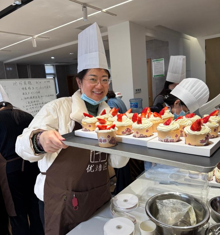 大家热情高涨,互相交流着烘焙心得和技巧,分享着生活中的点滴快乐。打蛋糊、装杯,烘烤,打发奶油,裱花,水果装饰……每一个步骤都充满了乐趣和创意。在烘焙的过程中,不仅锻炼了大家的动手能力,也增进了彼此之间的感情,让大家在忙碌的工作之余,享受到了难得的放松时光。